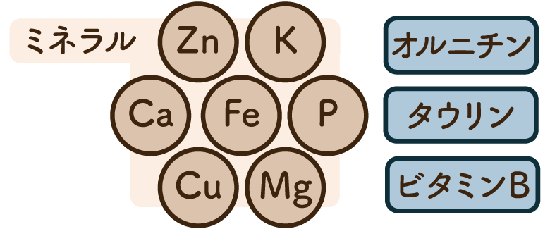 シジミとカキにはそれぞれ、亜鉛、カリウム、カルシウム、鉄、銅、マグネシウム、リンなどの必須ミネラルや、オルニチン、タウリンなどのアミノ酸、ビタミンBなど、生命維持に欠かせない豊富な栄養素を含有しています。いずれも、現代の偏った食生活においては不足しがちな栄養素であり、日々の食事で補うことで現代人を支えます。